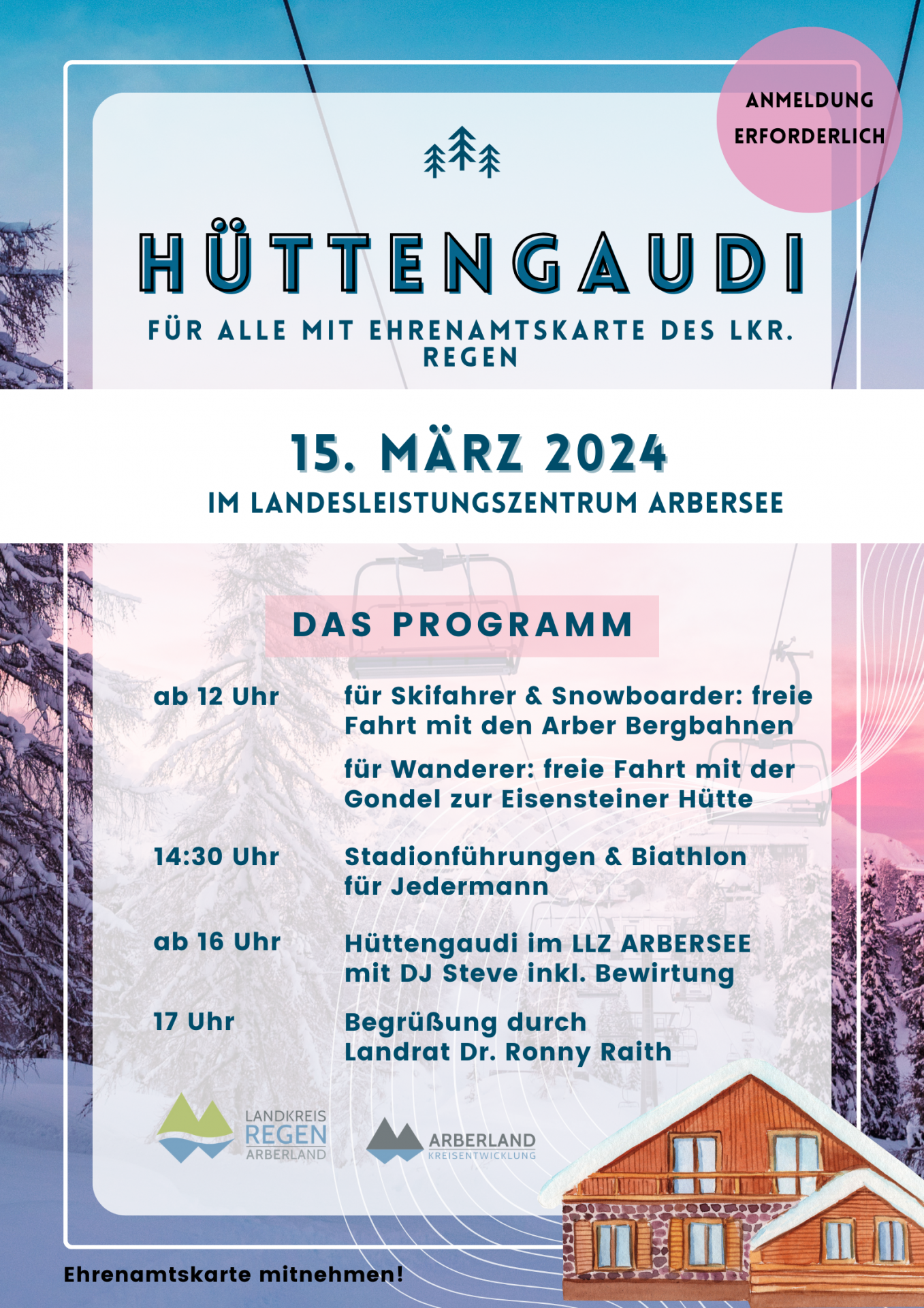 Bevor auch noch die letzten Überbleibsel des Winters vom Frühling verdrängt werden, lädt Doris Werner von der Ehrenamtsförderung ARBERLAND am Freitag, den 15. März alle Engagierten mit Ehrenamtskarte des Landkreises Regen zur Hüttengaudi am Fuße des Großen Arbers. „Damit wollen wir danke sagen für alles, was diese Bürgerinnen und -bürger seit Jahren für unsere Region und die Menschen hier leisten und hoffentlich noch lange leisten werden“, erklärt Werner, die wieder ein abwechslungsreiches Programm zusammengestellt hat.