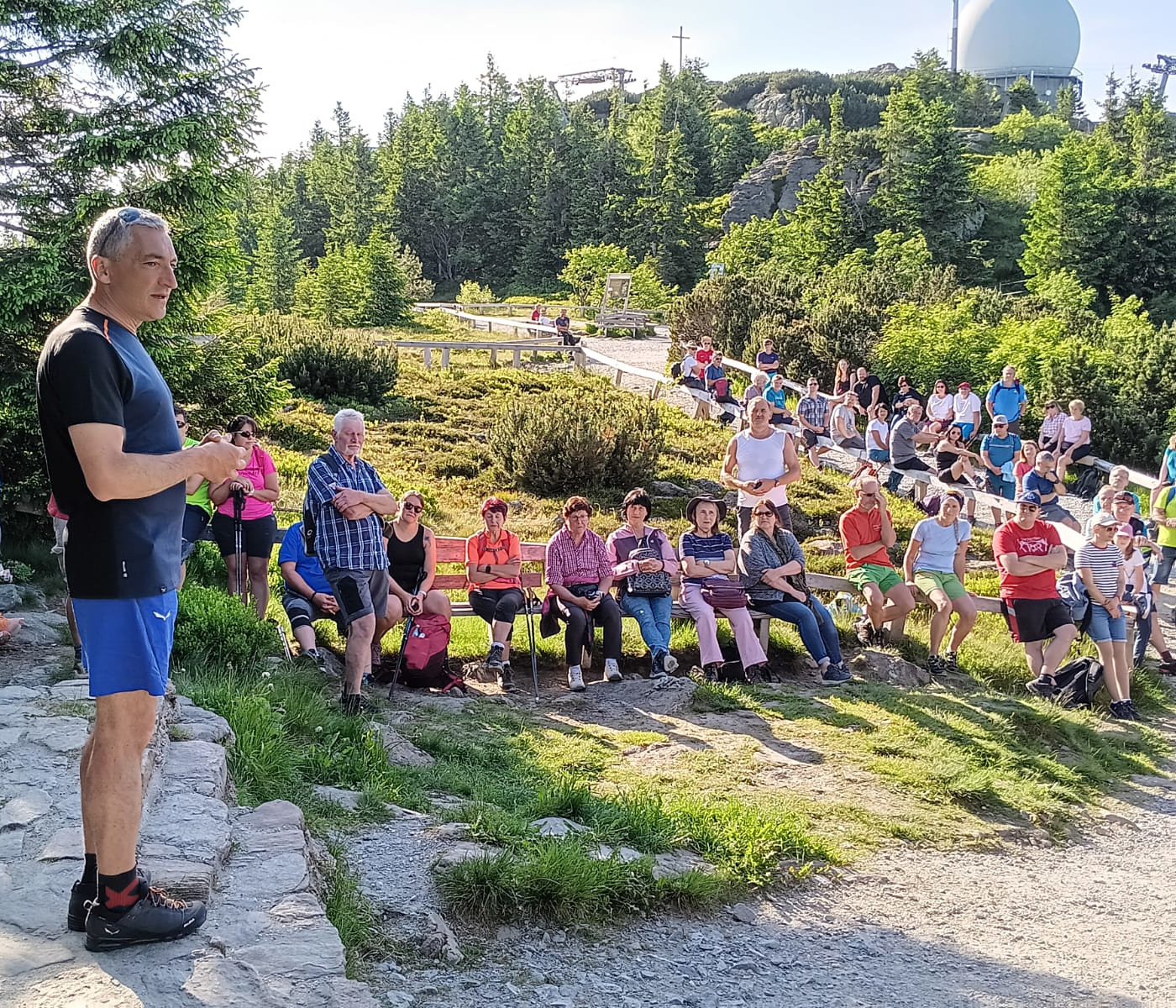 Auch Landrat Dr. Ronny Raith und seine Frau Sonja schlossen sich der Wandergruppe an. An der Arberkapelle wurde innegehalten: Georg Pletl, Vorsitzender des Bayerischen Waldvereins, und Andreas Tax, Gauvorstand des Bayerischen Waldgaues der Heimat- und Trachtenvereine, gaben einen kurzen Einblick in die Geschichte der Kapelle. Ruth Biendl-Weikl vom Knappschaftsverein Bodenmais stimmte mit Querflötenklängen ein Gedenken an, bei dem Landrat Dr. Raith insbesondere an den verstorbenen Altlandrat Heinz Wölfl erinnerte. Ihm ist an der Kapelle ein kleines „Marterl“ gewidmet. Nach einem gemeinsamen Gebet wurde ein selbstgebundener Kranz niedergelegt. Landrat Raith nutzte die Gelegenheit für ein persönliches Wort des Dankes: „Was Sie alle leisten, ist von unschätzbarem Wert. Sie sind das Rückgrat unseres gesellschaftlichen Lebens im Landkreis. Mein besonderer Dank gilt heute auch Doris Werner, die sich seit vielen Jahren mit Herzblut für unsere Ehrenamtlichen einsetzt und diesen Ausflug erneut mit viel Engagement ermöglicht hat.“