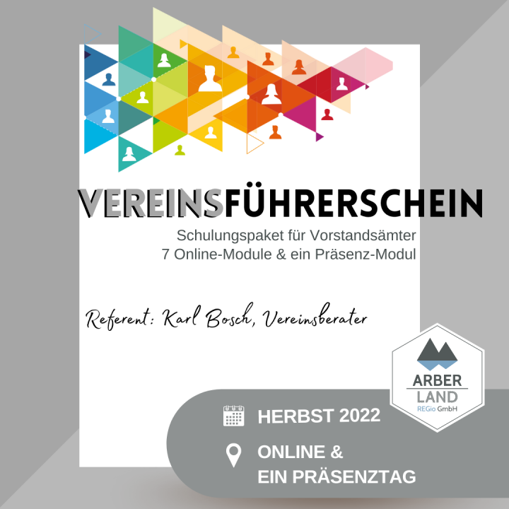 Was macht einen zukunfts- und mitgliederorientierten Verein aus? Wie motiviert man zur Übernahme von Vorstandsämtern – und welche Stolperfallen müssen potenzielle Führungskräfte bei ihrer verantwortungsvollen Tätigkeit beachten? Auf diese und zahlreiche weitere Fragen will das neue Fortbildungsprogramm „Vereinsführerschein ARBERLAND“ ab Herbst 2022 Antwort geben. Organisiert wird das Schulungsangebot vom Regionalmanagement des Landkreises Regen.